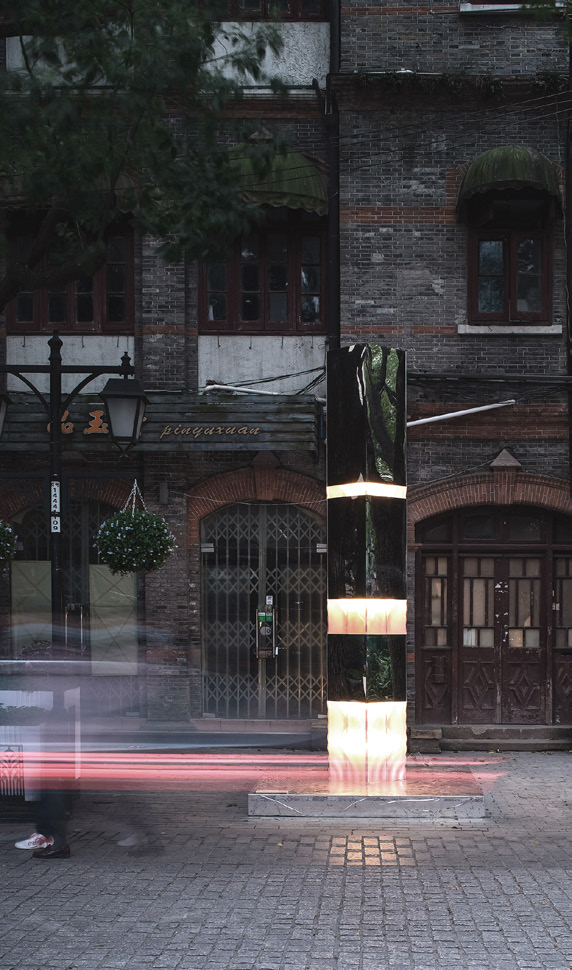 一件街道中的构筑物往往会成为人们对于一个熟悉环境的记忆标识,熟悉街道带来的安全感,在高速发展而且同质化的大都市里显得尤为重要。这件作品从一开始便确定了“反射”与“半透明”两种介质。装置通过镜面亚克力来完成对于“曾经的树”的映射之后,设计师还在其中加入了三维打印的特殊造型的透明构建,使其成为此地独有的唯一存在,也是承载“熟悉”感觉的载体。