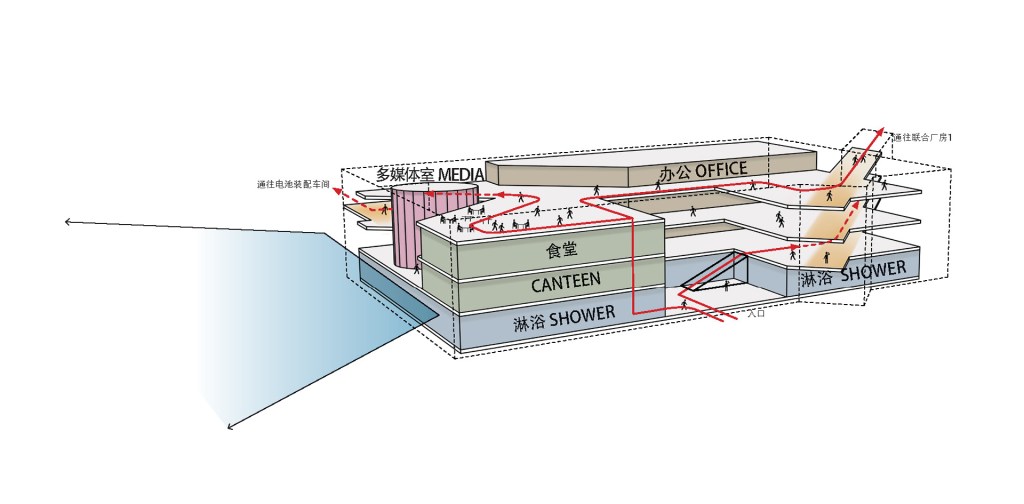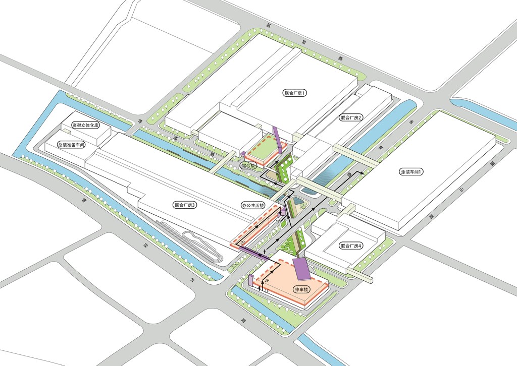 整个厂区规划以三栋生活类建筑为所有生产厂房的“策源地”,通过建筑连廊、景观绿轴等设计手法,将三个建筑在多个层面联系在一起,强化厂区的核心斜向轴线,形成其内部最高效、完整交通流线。