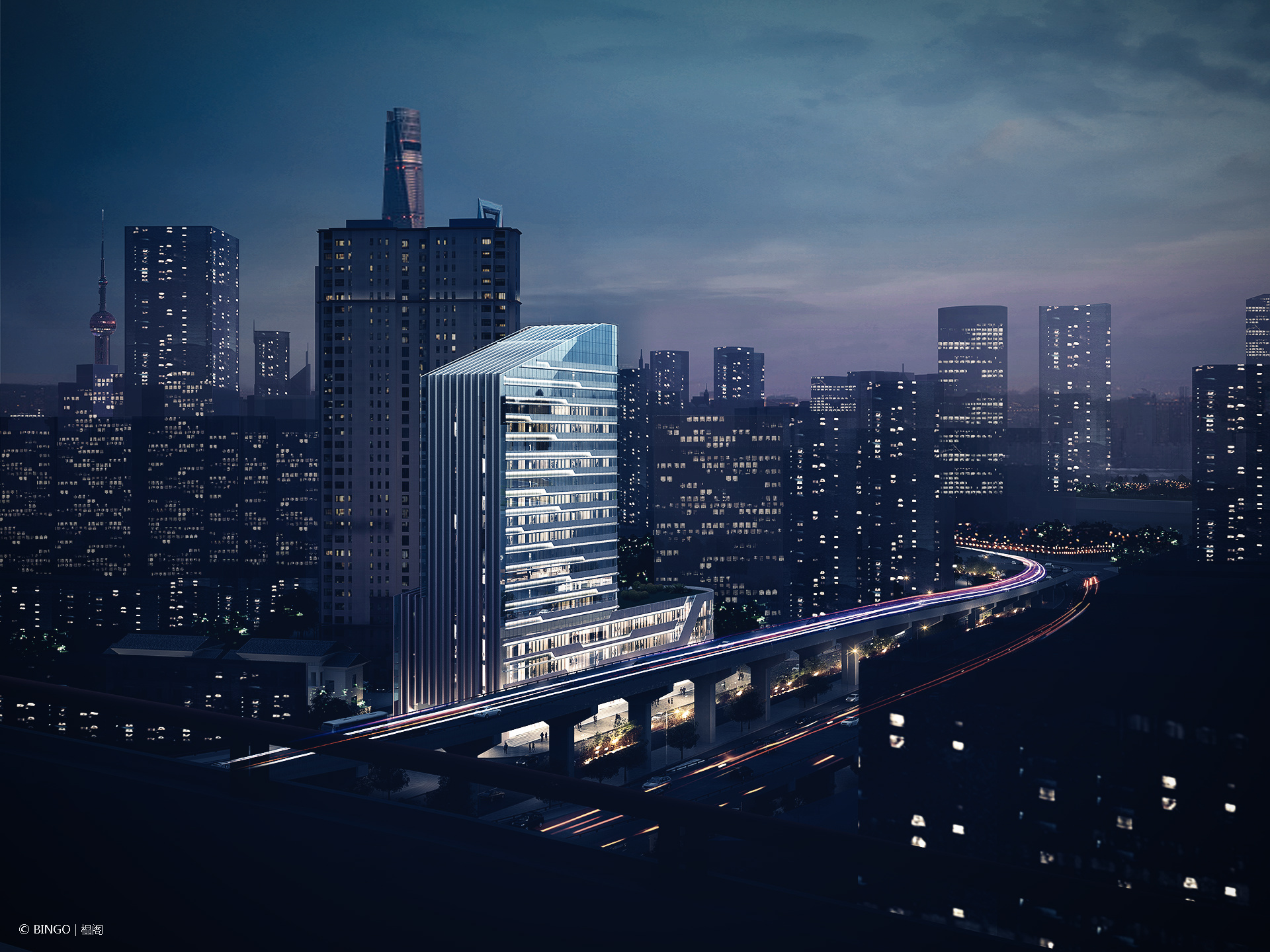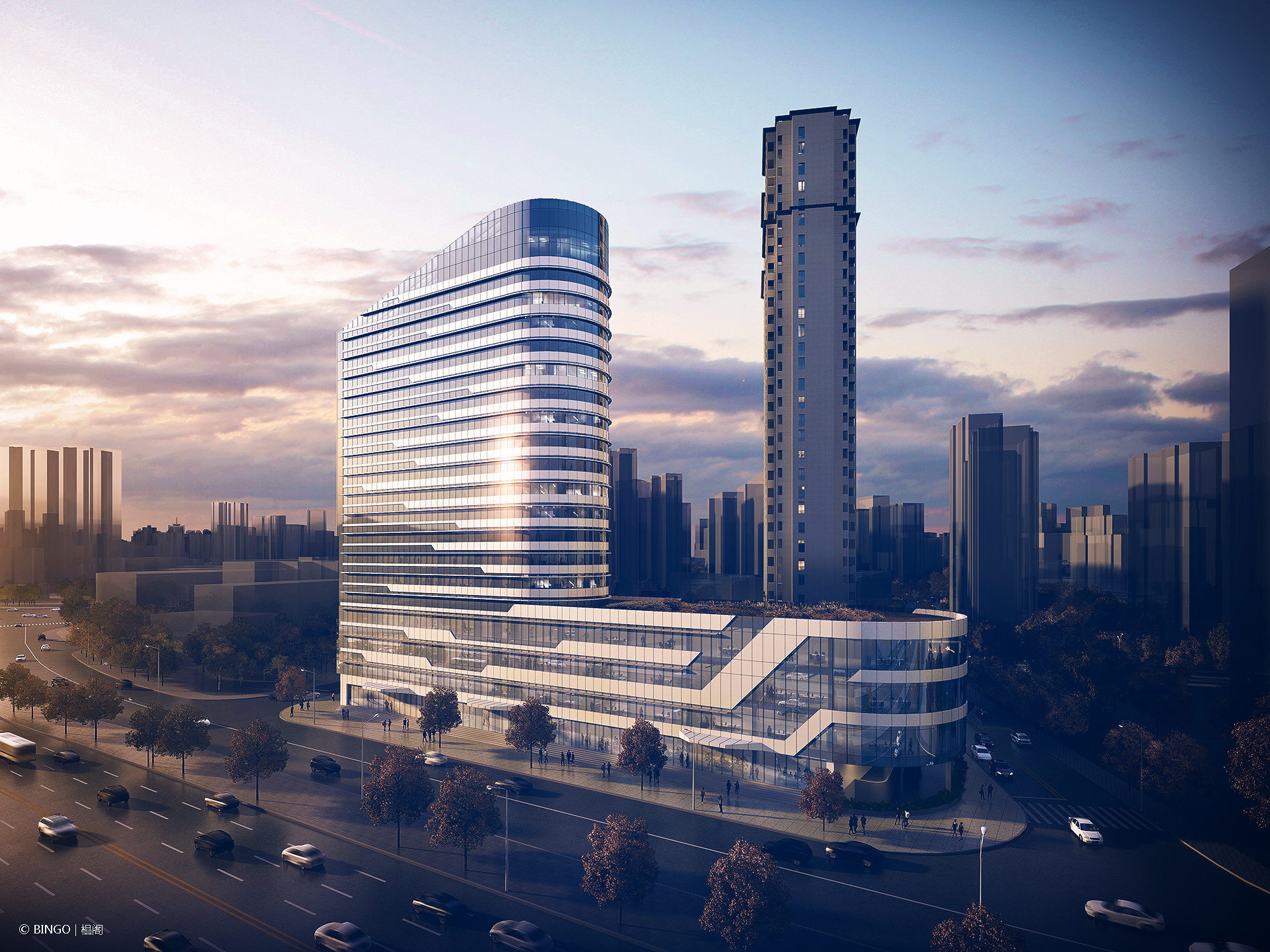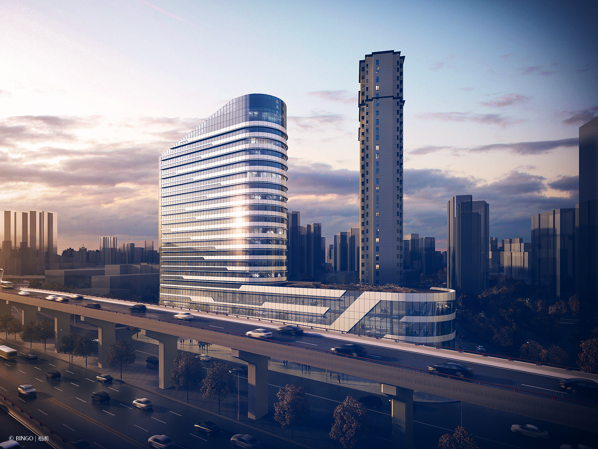 在新一轮的外立面设计中,依旧沿用了原来游船与江水的概念, 通过利落的横向线条将建筑原本富有特色的形象更加强化的同时赋予建筑以轻盈的动感,在川流不息的南浦大桥上飞驶而过时,仿佛觉得建筑真的在前进一般。