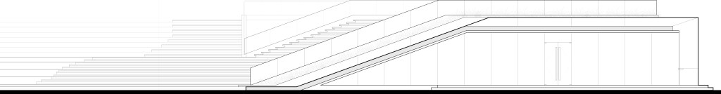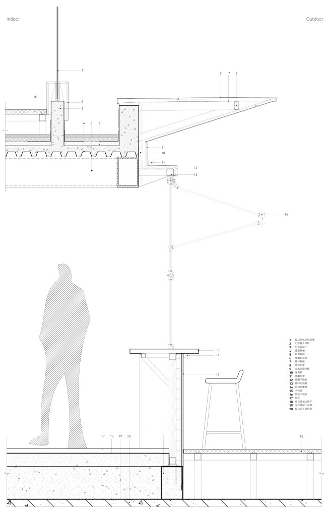 建筑造型通过顺延西侧的景观台阶后,再“提起”其端部,自然地形成下方的使用空间和上方的活动平台。接着将部分的楼梯踏步合并,形成面向西南方向的可坐台阶,进而成为了一处被精心设计的黄浦江景观的取景点。