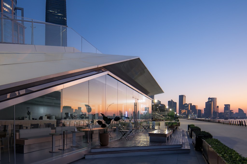 为了最大限度的达到“无形”的建筑效果,外墙采用了隐框夹胶超白玻璃幕墙。在内部营业时段,灯光亮起,玻璃几乎完全不可见,内部能够清晰地展现出来。而在营业时间之外,内部灯光熄灭后,玻璃又能将黄浦江对岸的建筑映射出来,与背景完美地融合在一起,模糊了建筑的边界。