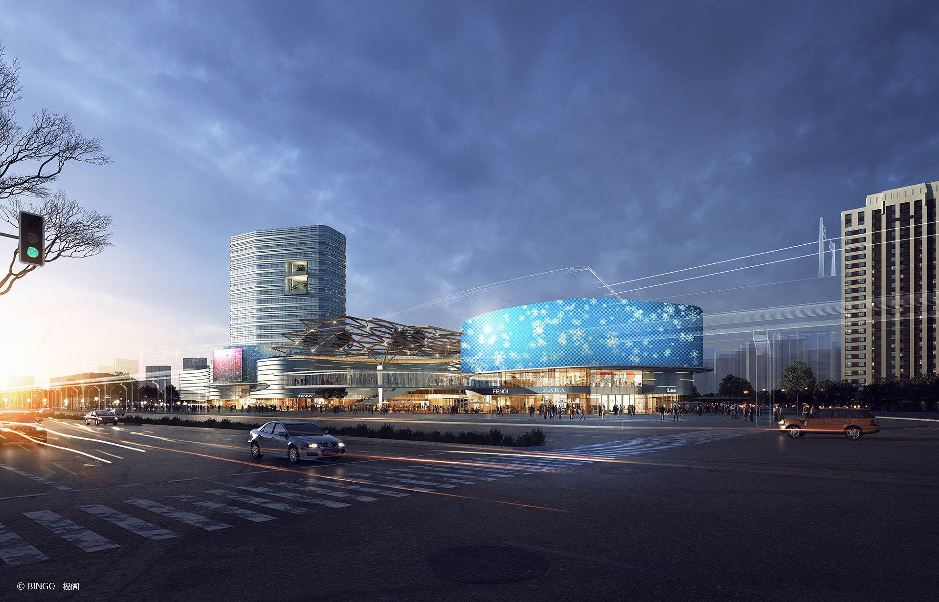 项目位于天津滨海新区,总建筑面积约68,000平方米,其中商业51,000平方米,办公17,000平方米。地铁Z4线穿过基地,计划与轻轨9号线在地块内实现两线换乘。方案设计利用轨交换乘优势,以TOD为核心理念,围绕公交枢纽打造区域商业标杆。