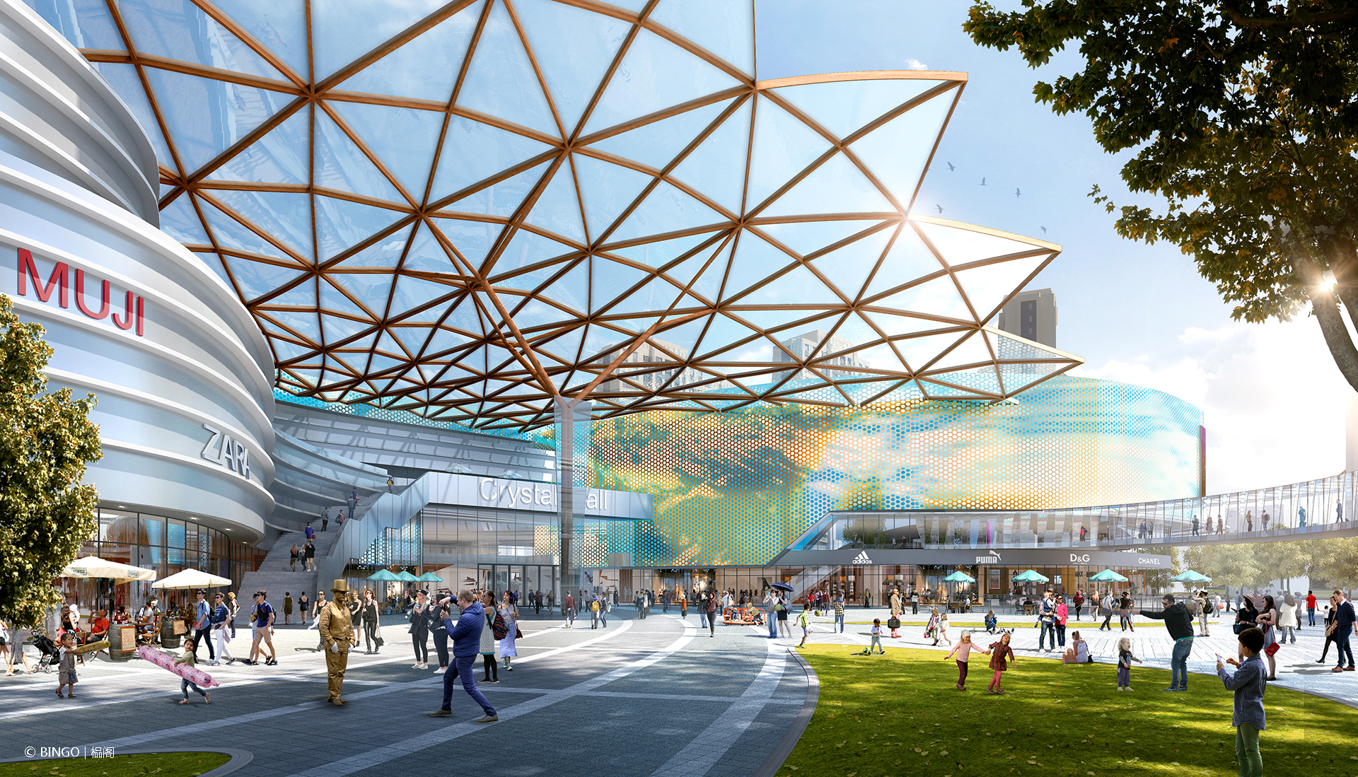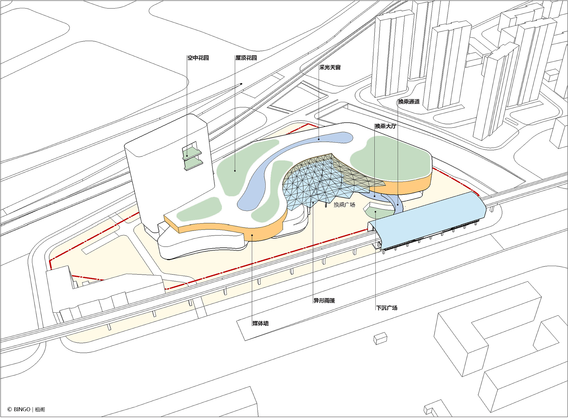 商业围绕核心换乘广场布置,兼顾天津的气候特点,在广场上方设置异形雨棚,保证各种天气状况下广场的使用率,鼓励周边居民及办公白领的户外活动和交流,进一步凸显项目在轻轨沿线的特色标志形象。